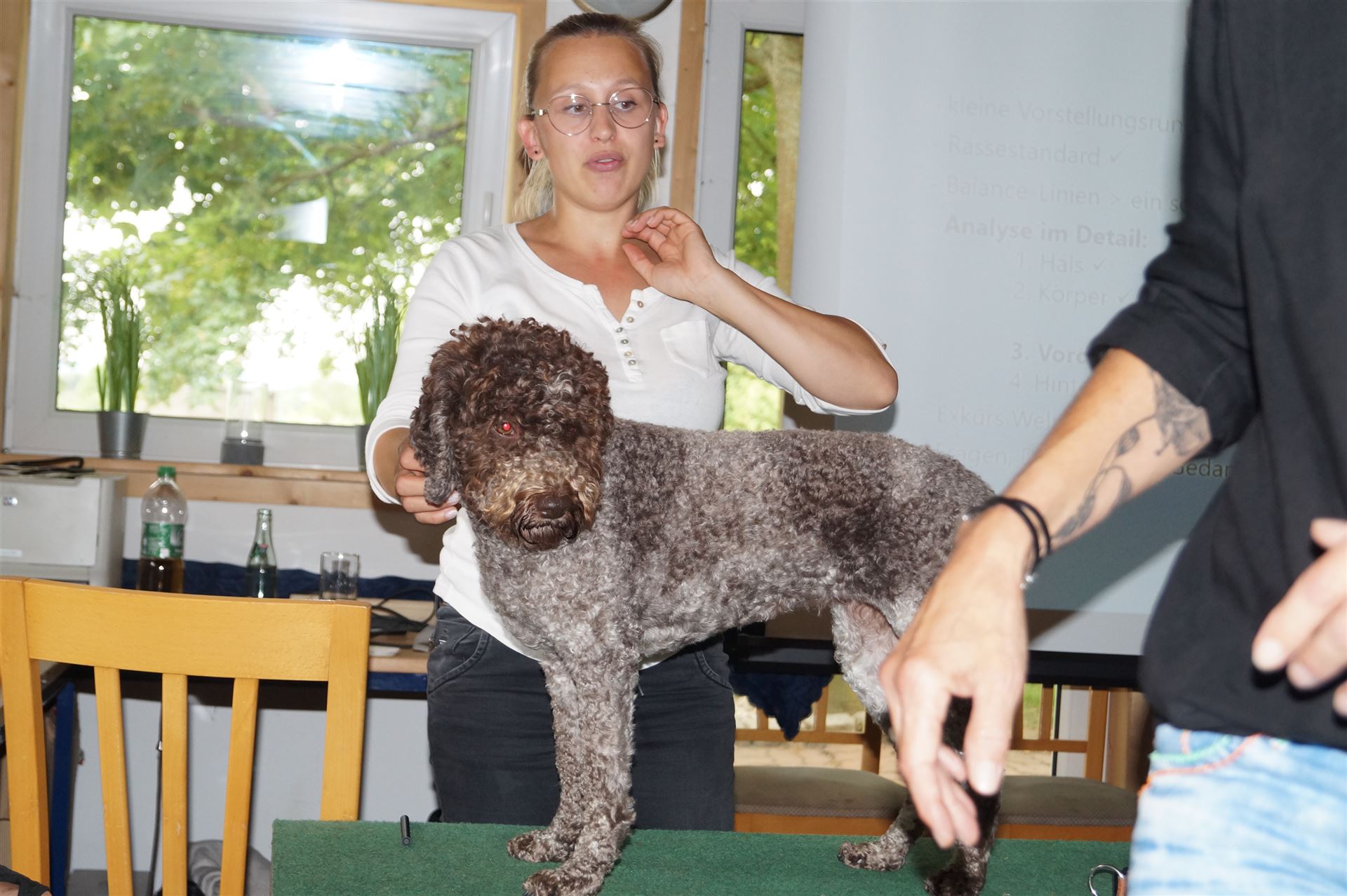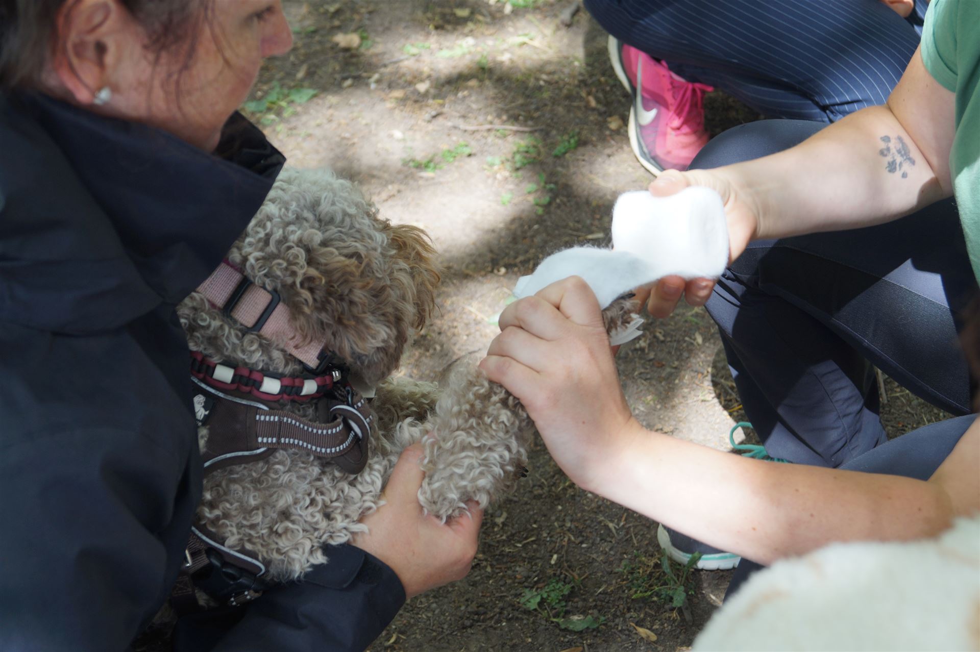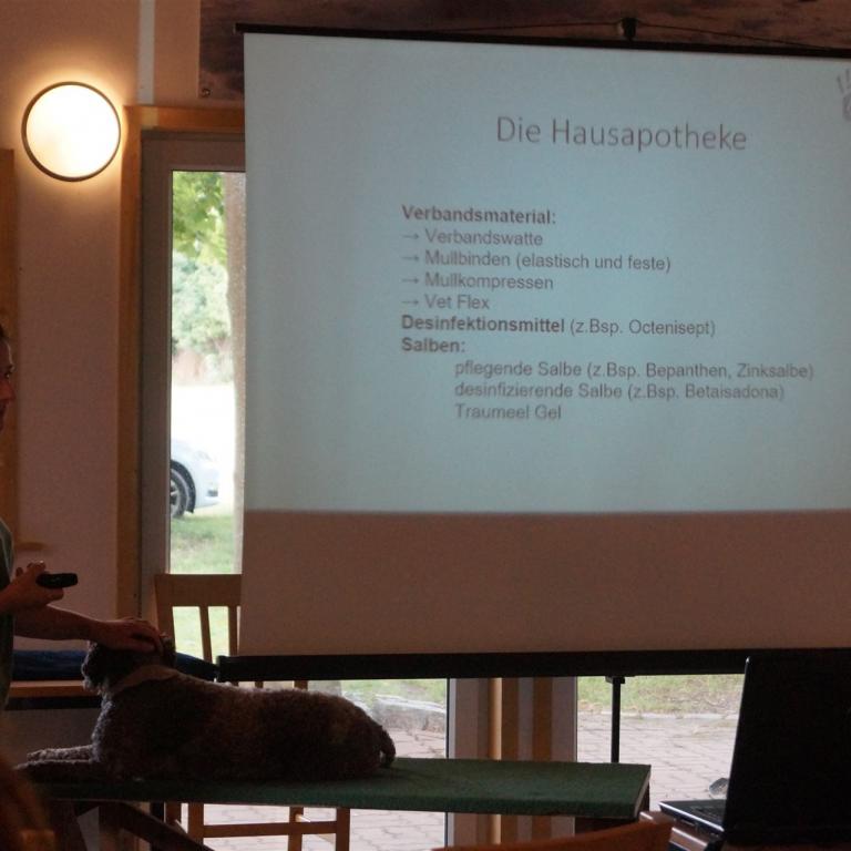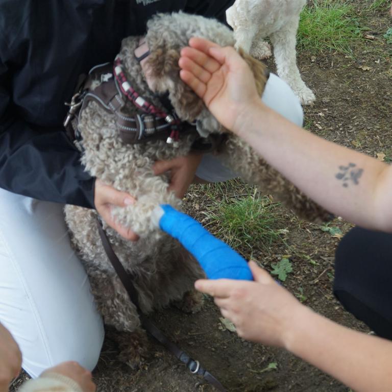 Sonntag starteten wir pünklich nach einer Begrüßung Begrüßung gleich mit dem Seminar "Erste Hilfe am Hund". Die Dozentin war sehr gut vorbereitet und erklärte ganz professionell und detailreich verschiedene Situationen. Besonders spannend wurde der praktische Teil am Hund und die Informationen informativ...: wie kann ich Hilfe leisten? Ab wann muss ich zum Tierarzt? Wie erkenne ich einen dringenden Notfall? usw. Wir haben sehr viel Input bekommen . Alle Lagotti haben sich gekonnt und komplett stressfrei als Model zur Verfügung gestellt als es zum Verbände anlegen ging.