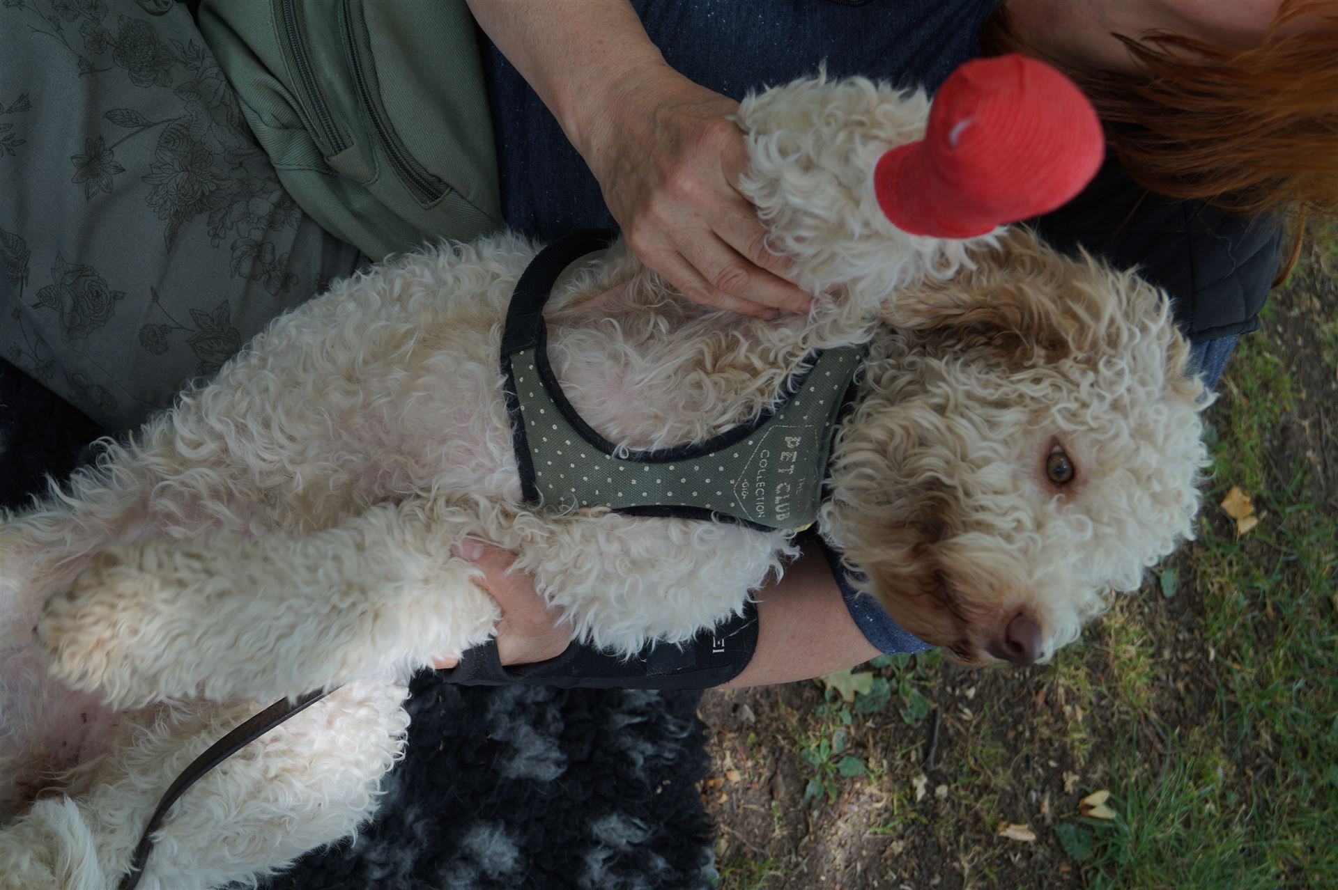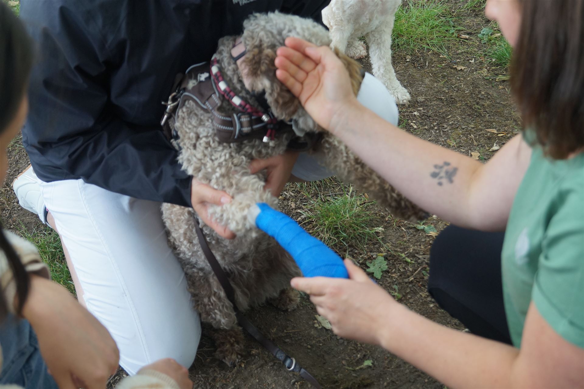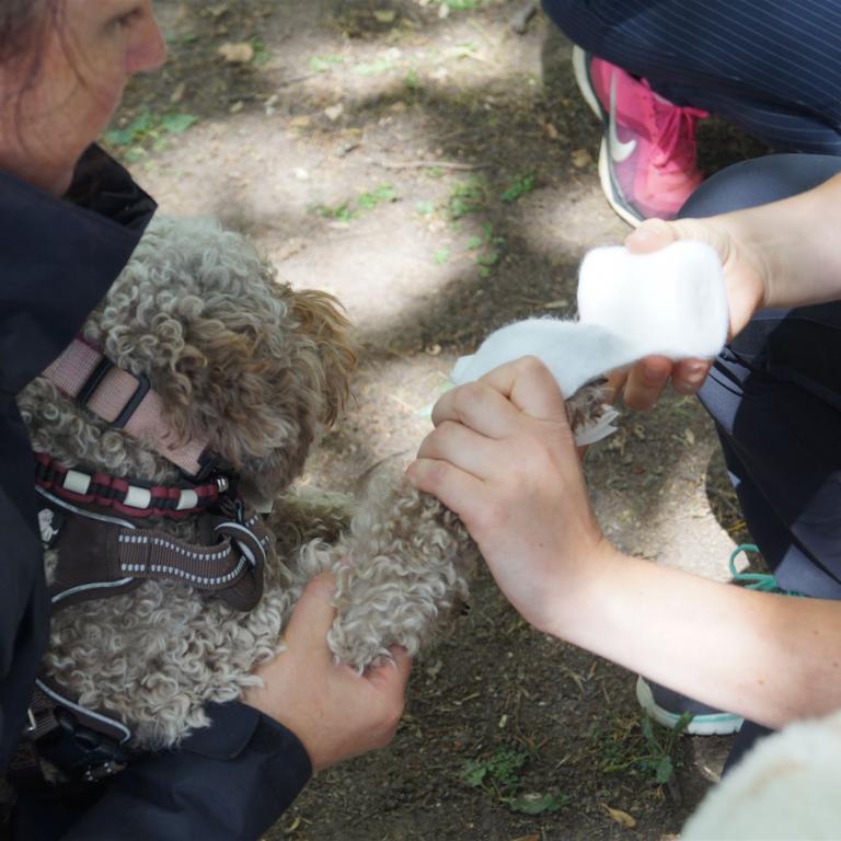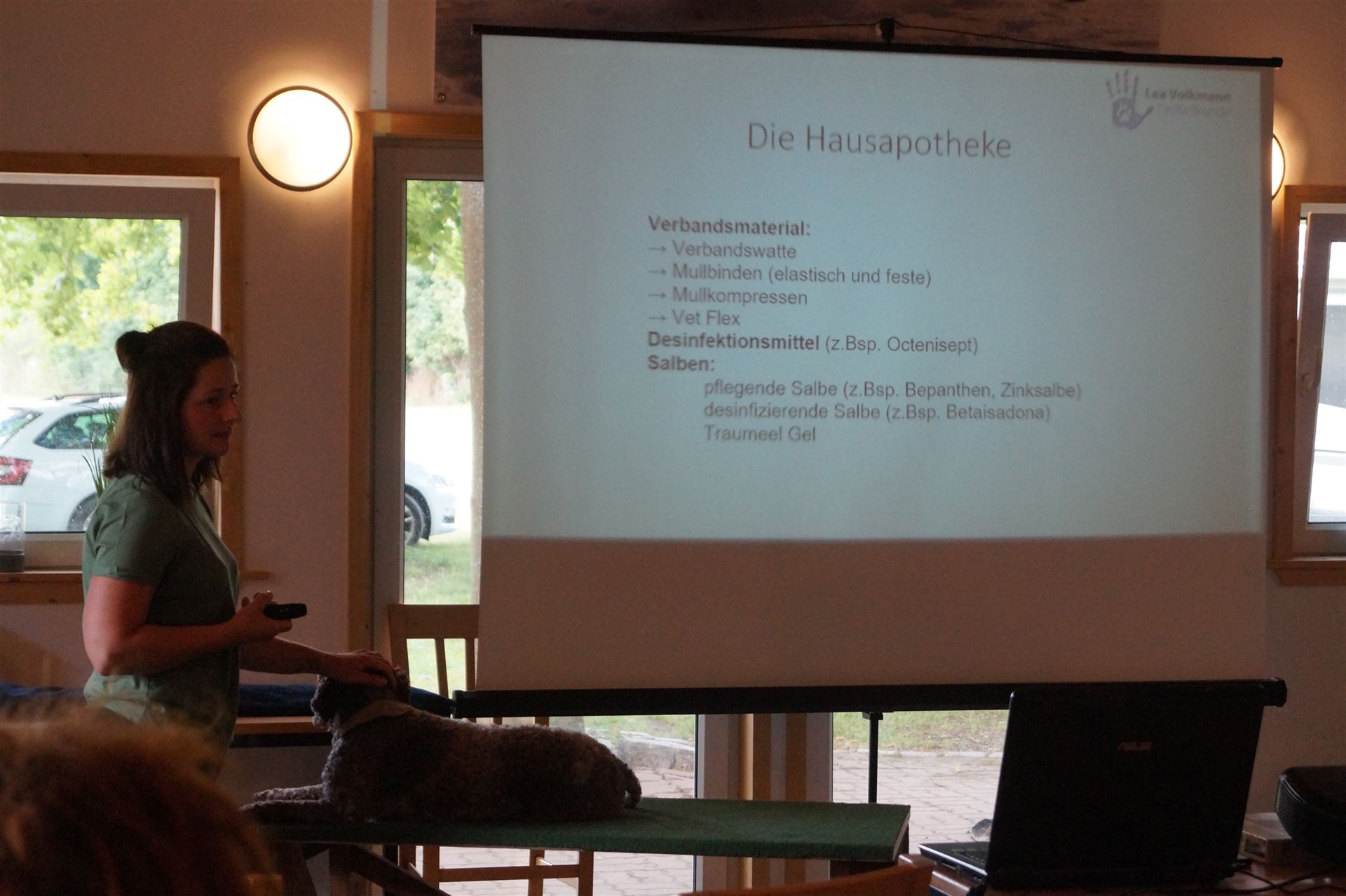 Sonntag starteten wir pünklich nach einer Begrüßung Begrüßung gleich mit dem Seminar "Erste Hilfe am Hund". Die Dozentin war sehr gut vorbereitet und erklärte ganz professionell und detailreich verschiedene Situationen. Besonders spannend wurde der praktische Teil am Hund und die Informationen informativ...: wie kann ich Hilfe leisten? Ab wann muss ich zum Tierarzt? Wie erkenne ich einen dringenden Notfall? usw. Wir haben sehr viel Input bekommen . Alle Lagotti haben sich gekonnt und komplett stressfrei als Model zur Verfügung gestellt als es zum Verbände anlegen ging.