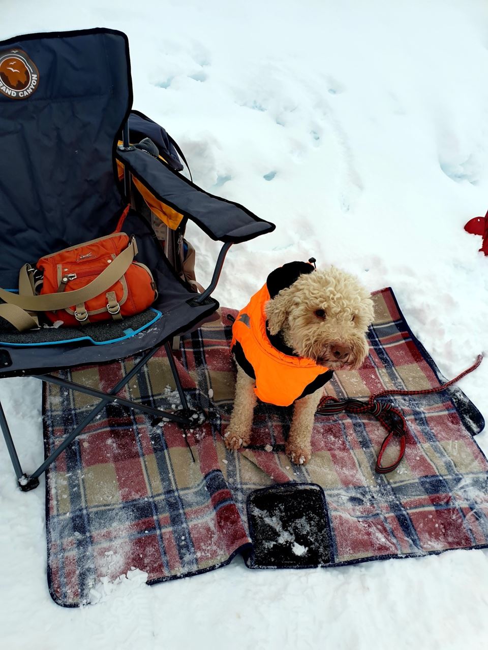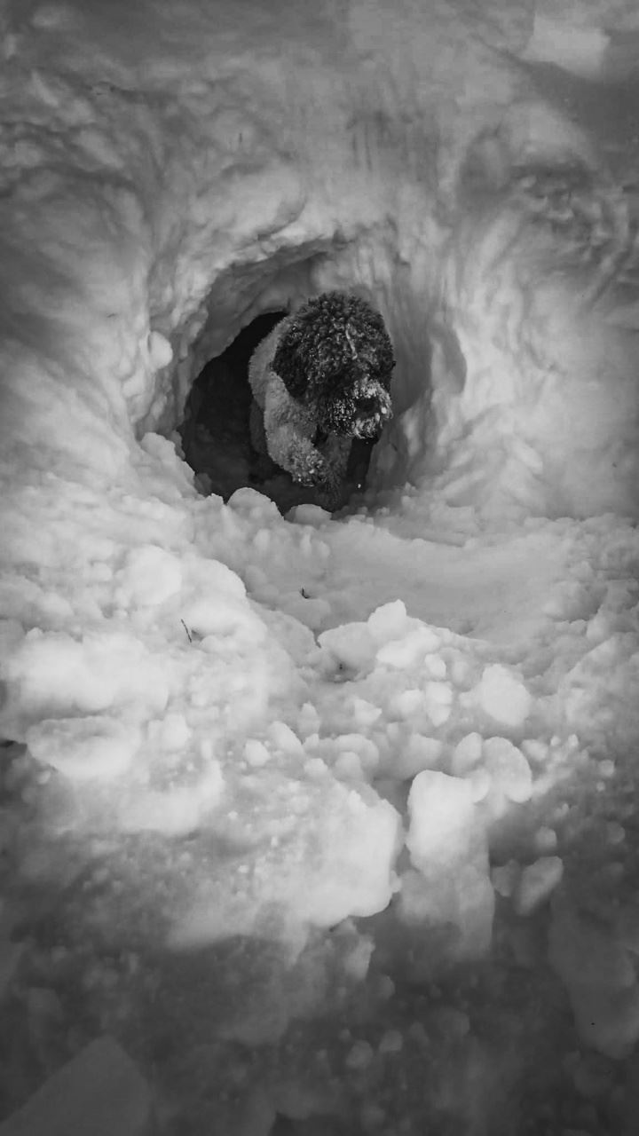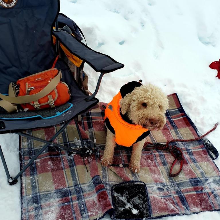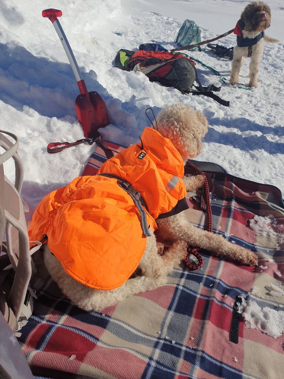 Nach der Pause mit einem leckeren Essen bei der strahlender Wintersonne im freien durften wir uns nochmal ausprobieren, eingegrabene Tasche im Schnee zu suchen, das war schon eine Herausforderung für unsere Hunde..