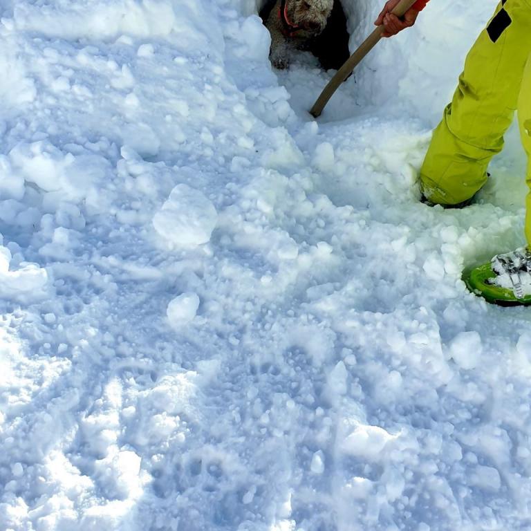 18 hochmotivierte Hundeteams und wir zwei Teams aus Deutschland (Ingrid mit Calypso , Jutta mit Baccio ) lernten den Aufbau des Feinsuchens im Schnee, das Suchen von Gegenständen und die Königsdisziplin, das Suchen und Ausgraben von verschütteten Personen. Sobald unsere Hunde merkten, dass sie auch bei dieser Arbeit ihre hervorragenden Nasen einsetzen können und vor allem danach graben dürfen, waren sie fast nicht mehr zu halten.