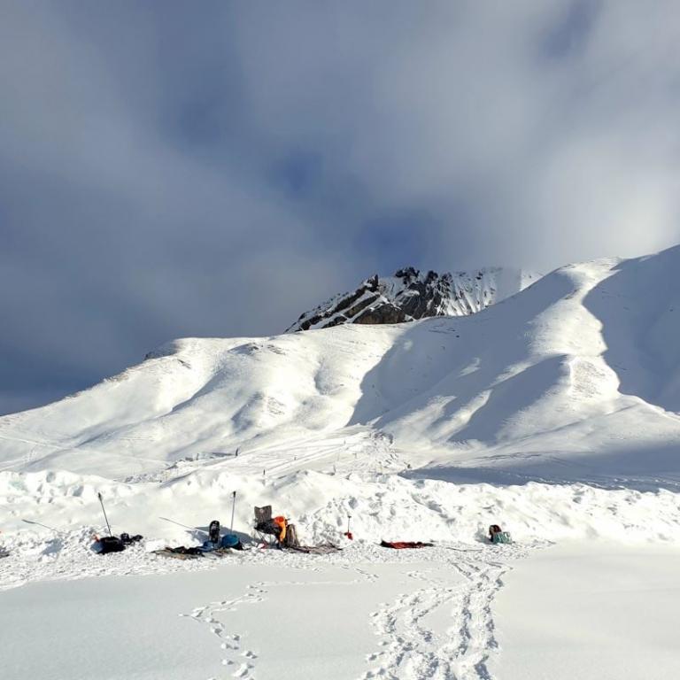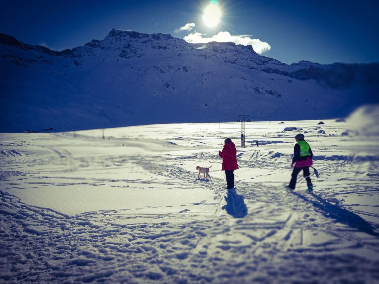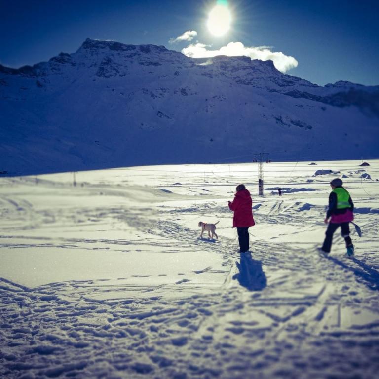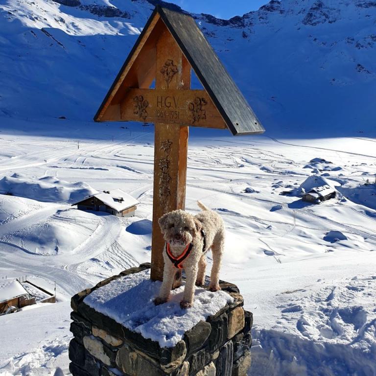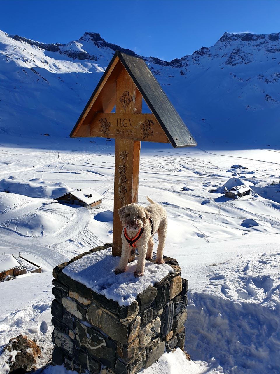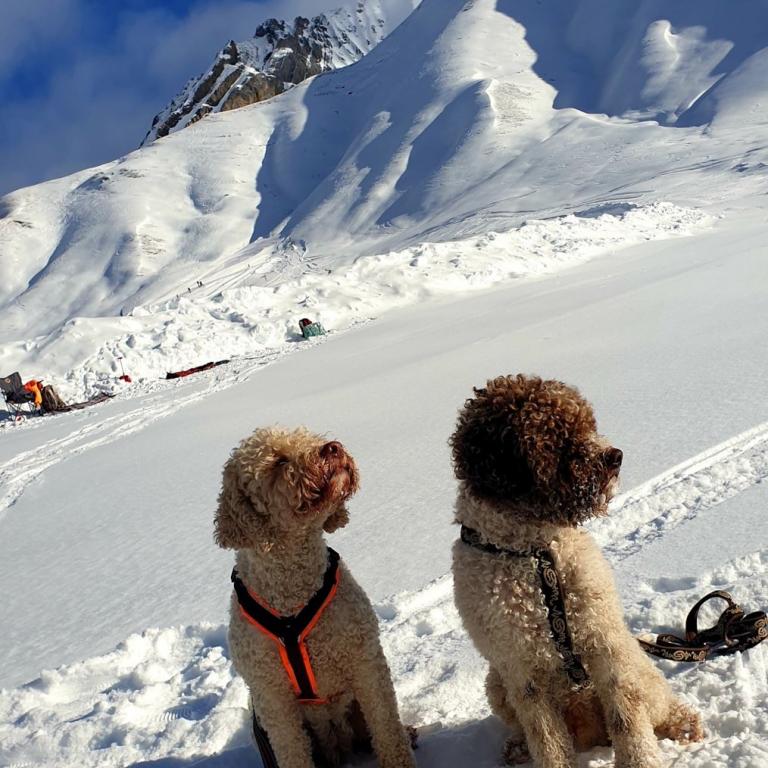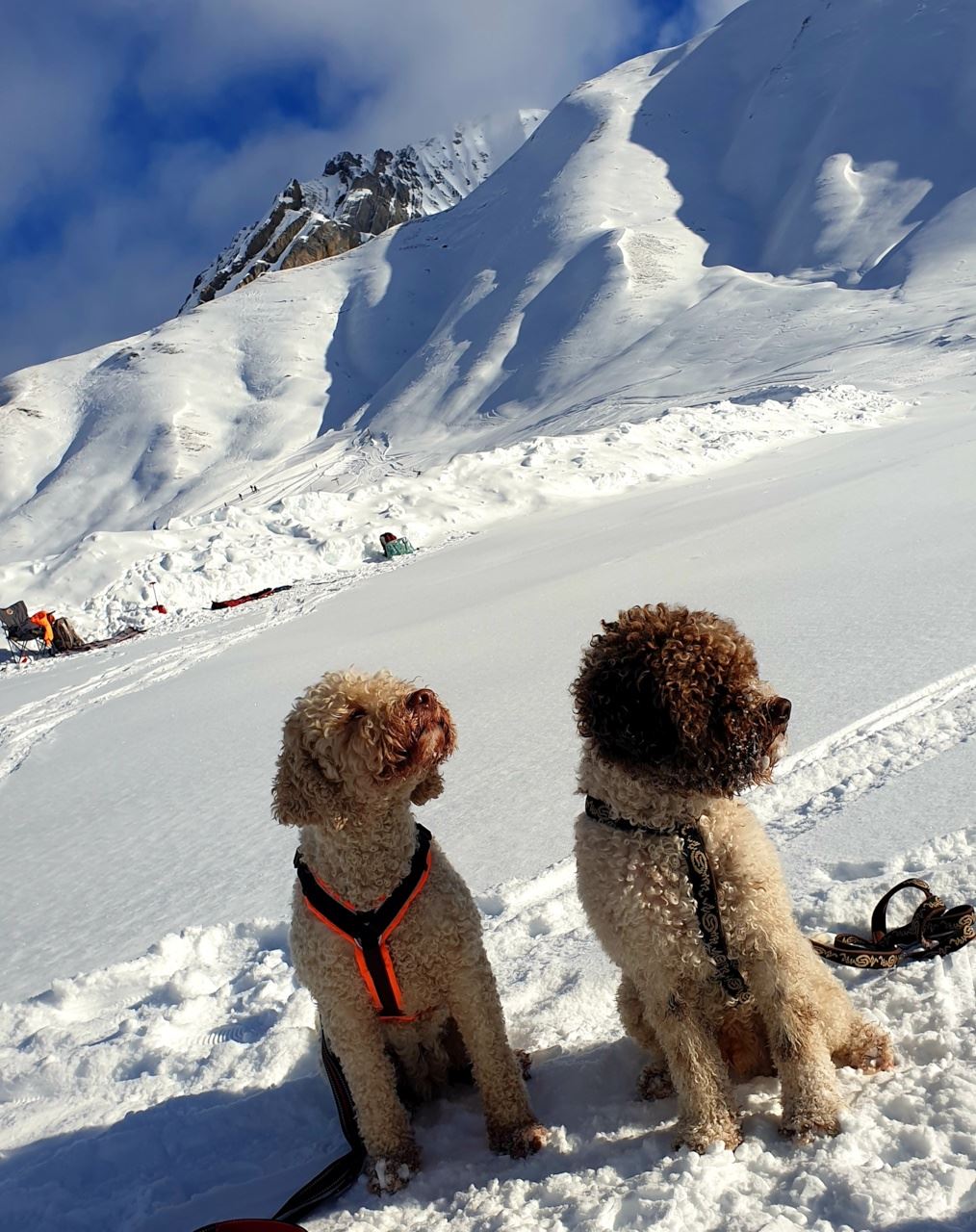 Bei einem wunderschönem Winterwetter fand am 22. Januar 2022 der Schnupperkurs Lawinenhund für Lagotti unter der Leitung von Pascal Utz, auf der Engstilgenalp in der Schweiz bei Adelboden statt. Nachdem wir uns selbstständig vom Parkplatz mit der Seilbahn auf den Arbeitsplatz befördert hatten, mussten wir die erste Herausforderung meistern: Wie binde ich einen Hund auf einem Schneefeld fest? Zum Einsatz kamen die vorbereiteten Schneidbretter mit Leinen, welche wir eingruben und uns dann gemütlich im Schnee eingerichtet haben.