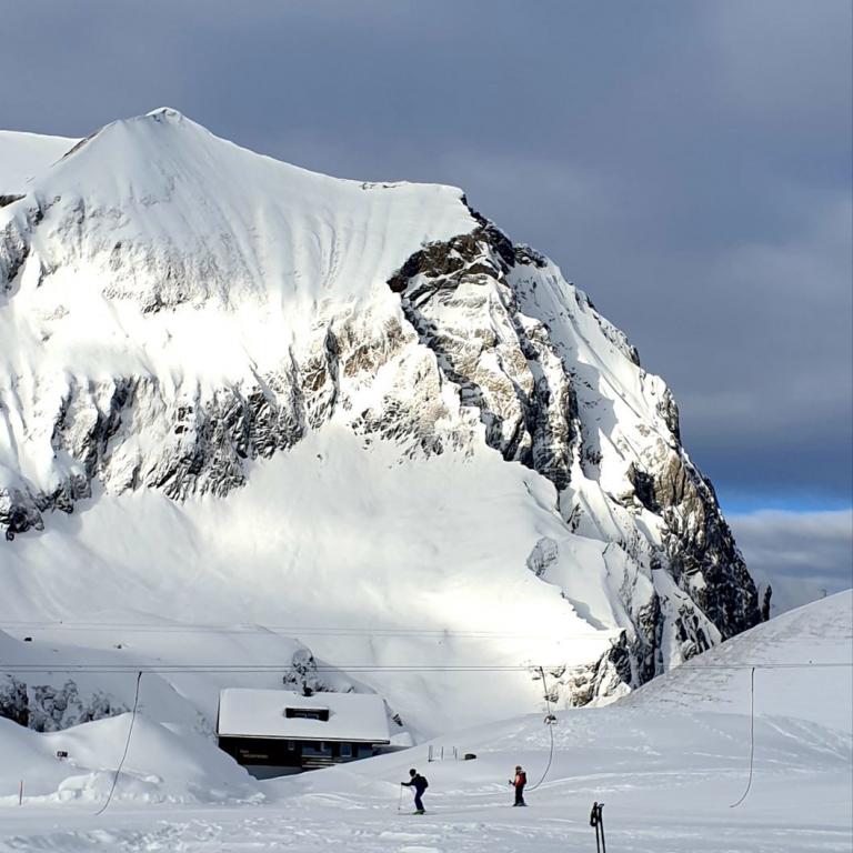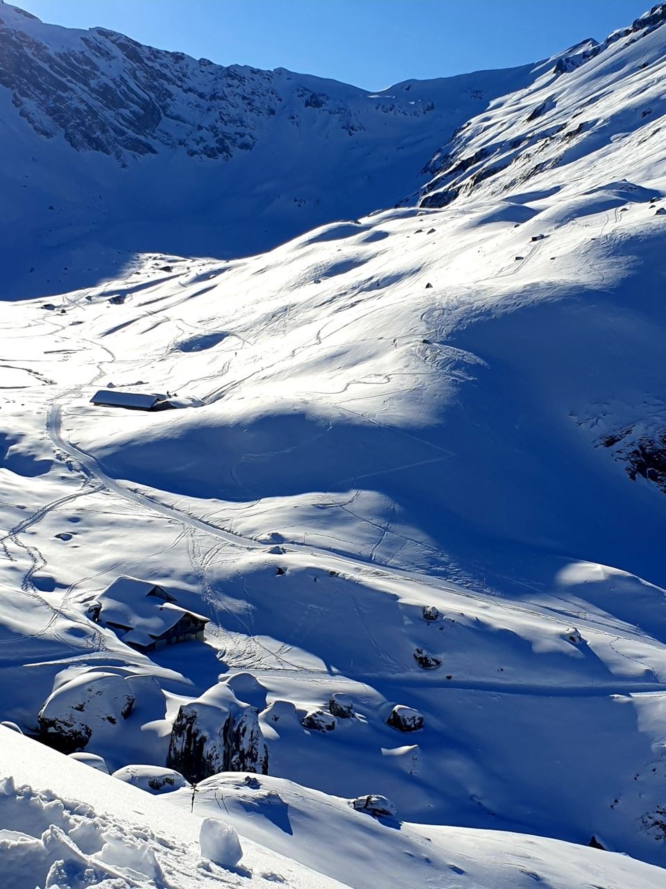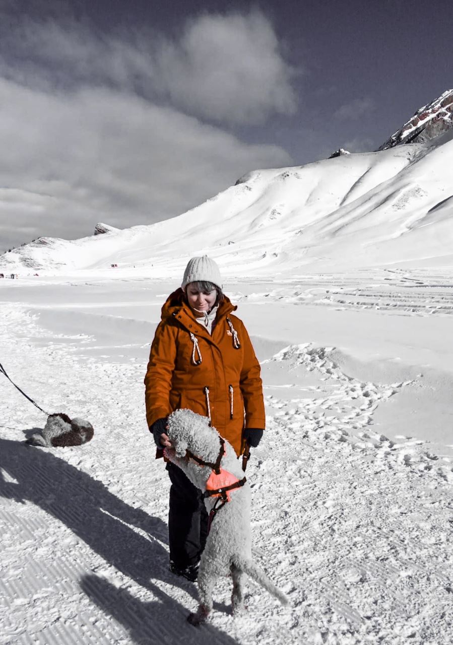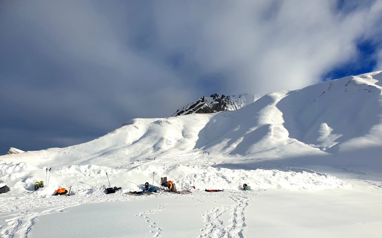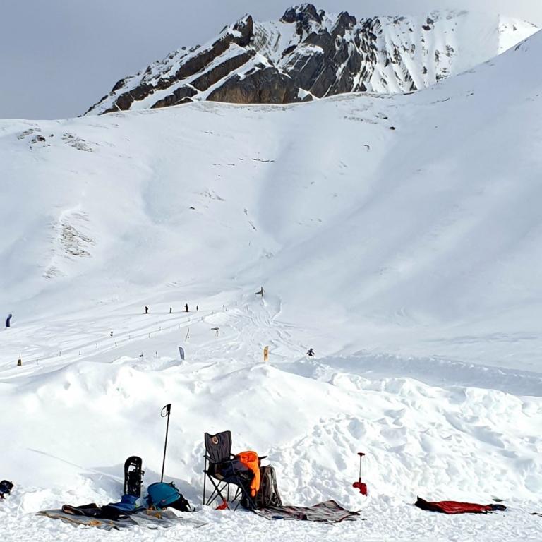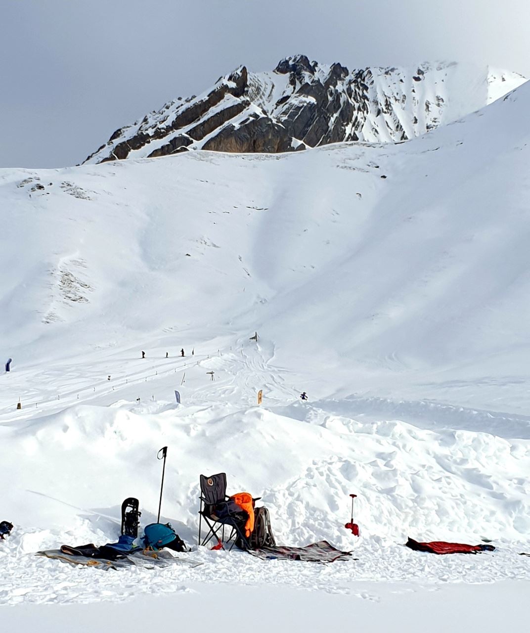 Bei einem wunderschönem Winterwetter fand am 22. Januar 2022 der Schnupperkurs Lawinenhund für Lagotti unter der Leitung von Pascal Utz, auf der Engstilgenalp in der Schweiz bei Adelboden statt. Nachdem wir uns selbstständig vom Parkplatz mit der Seilbahn auf den Arbeitsplatz befördert hatten, mussten wir die erste Herausforderung meistern: Wie binde ich einen Hund auf einem Schneefeld fest? Zum Einsatz kamen die vorbereiteten Schneidbretter mit Leinen, welche wir eingruben und uns dann gemütlich im Schnee eingerichtet haben.