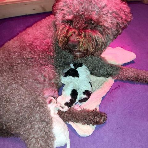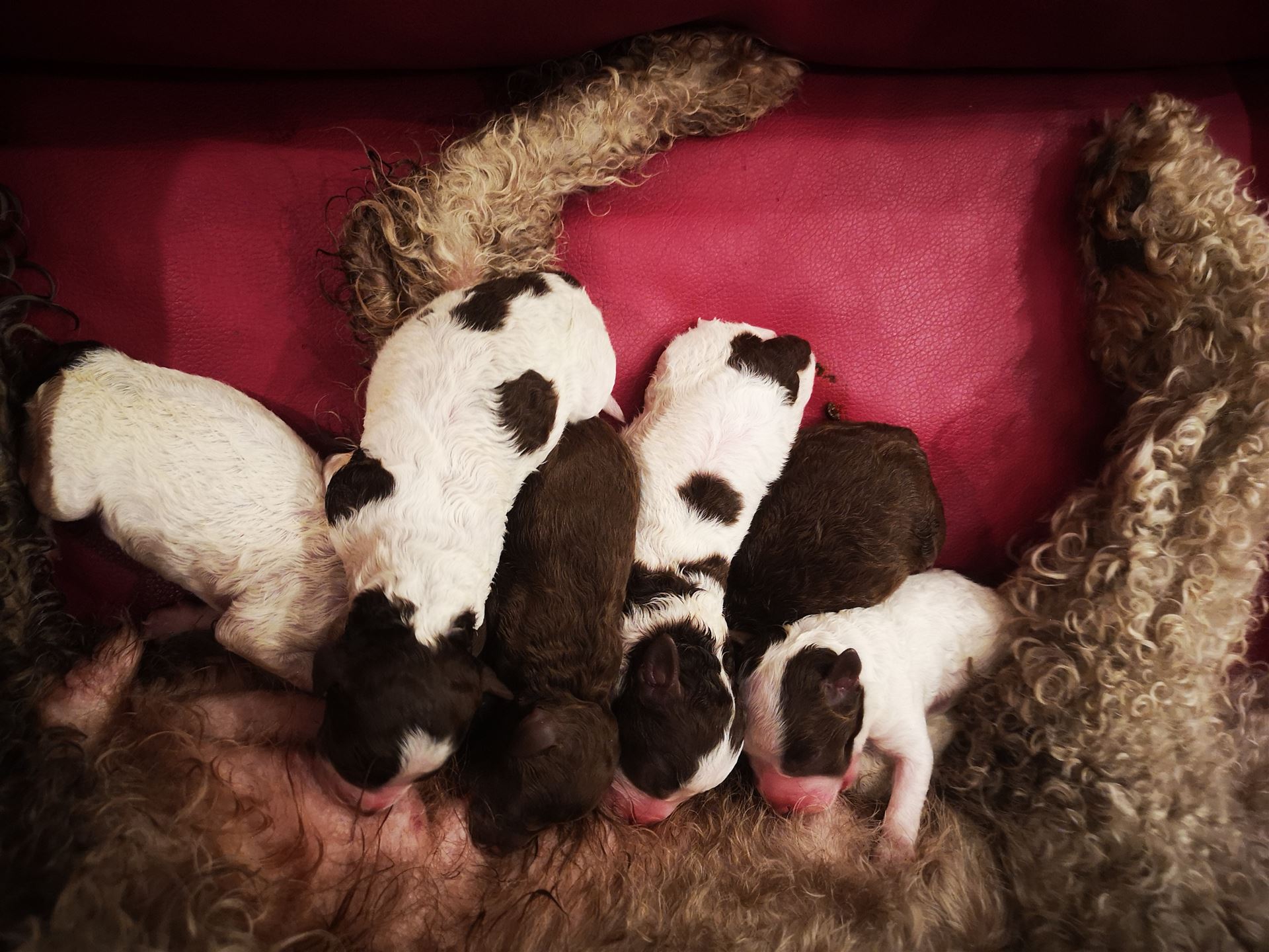 Unsere Hündin Magnatum Wild Curls Bonita hat nach dem Rüden Freddie Mercury di Tuscani Truffle Hunter am 1. Oktober 8 Welpen bekommen (4 Rüden und 4 Hündinnen).