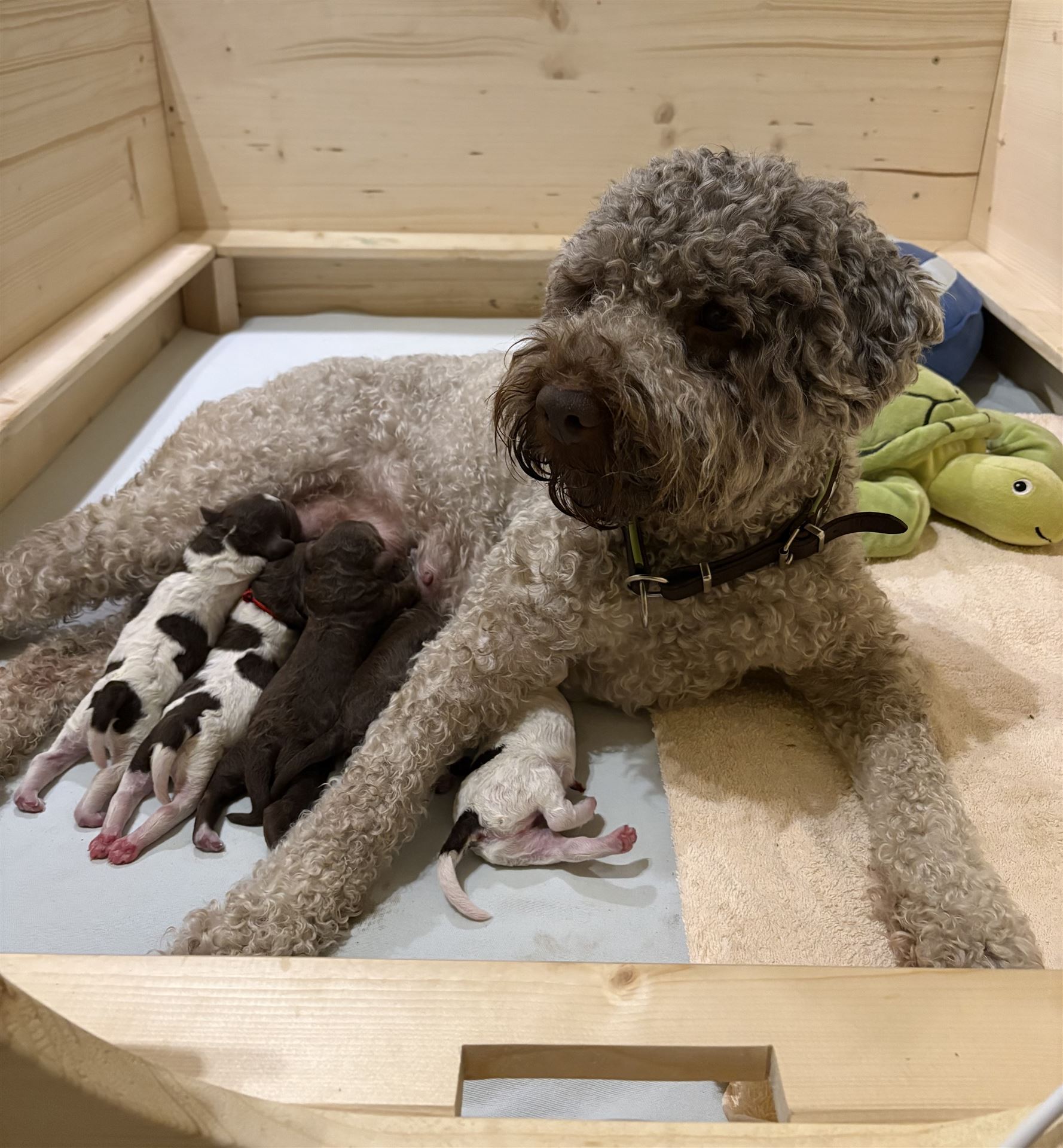 Unsere Hündin Aquislaro Ava hat nach dem Rüden Acqua e Terra Nino am 14. Juni 7 Welpen bekommen ( 3 Rüden und 4 Hündinnen).
